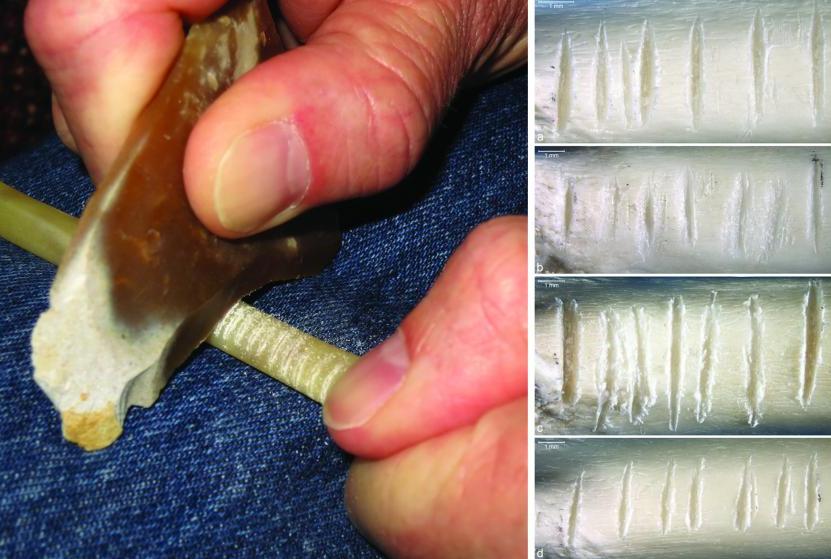 of the notches by sawing a chipped stone edge back and forth on a modern turkey